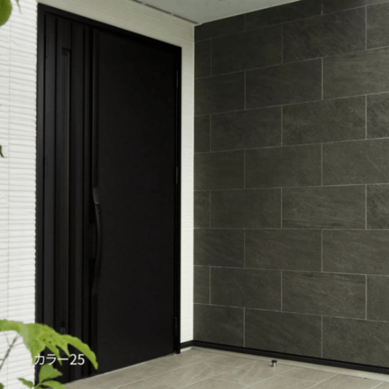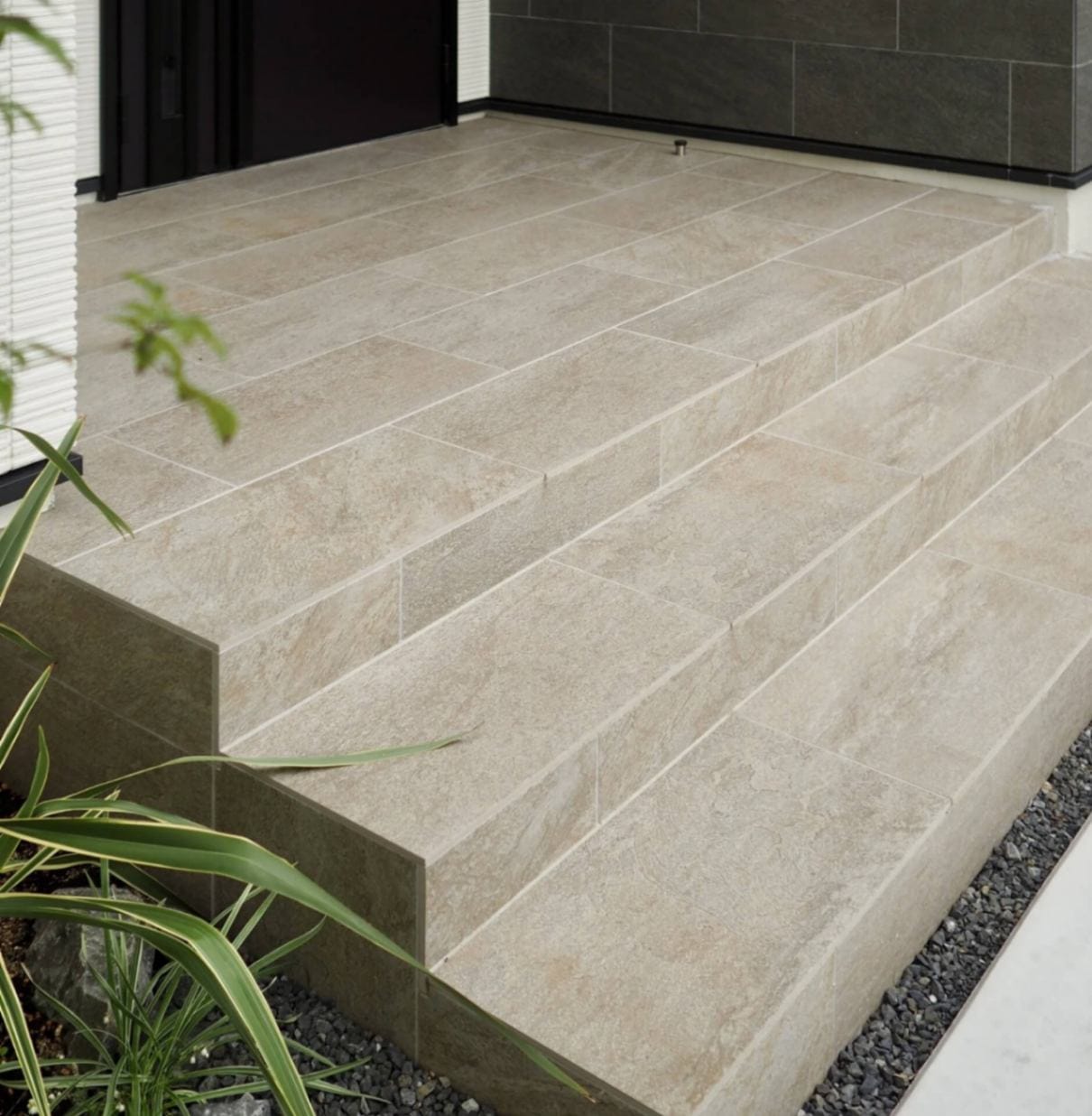 玄関ポーチ、エントランスを彩る天然石調のタイル。クォーツサイトのもつ雄渾な美しさが気品ある空間を演出します。グリップは独自のノンスリップ技術です。