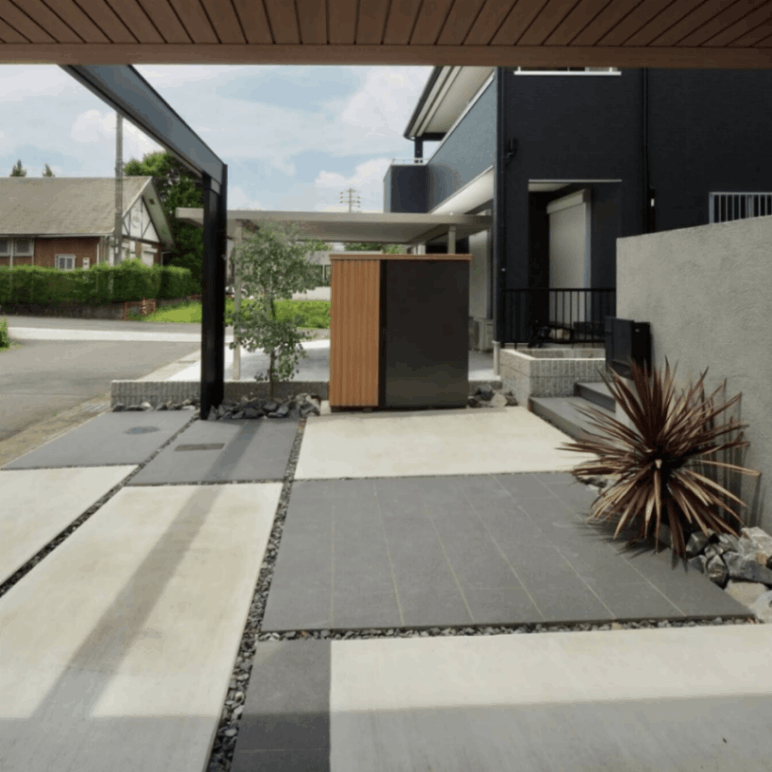 大粒グラニット調の重厚な黒の深みを永遠に。耐久性の高いタイルは色褪せしません。ランドスケープ・エクステリア外構に最適な、駐車場等車両乗り入れ部対応厚物タイル。