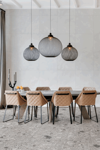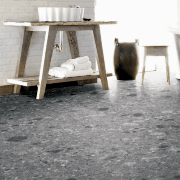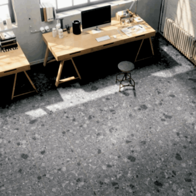 天然石の持つ本来の美しさに、タイルの持つ耐久性を融合させたテラゾ。屋外使用の可能なグリップ加工ですが、サラリとした面で屋内仕様にもお使いいただけます。