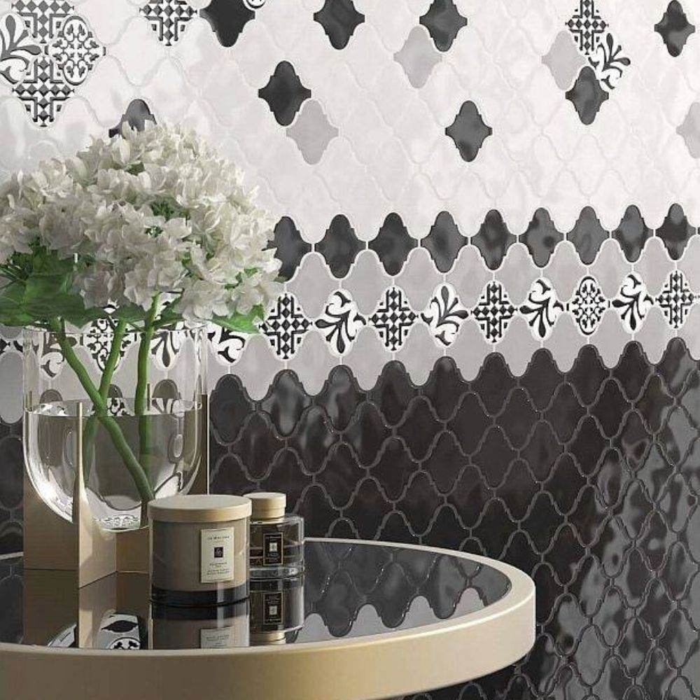 発色が良く、美しい形は壁面をアートのように魅せるタイルです。ランタン、アラベスクなどの呼び名のあるデザインは、古代ギリシャやローマの装飾模様が起源とされ、その後、サーサーン朝ペルシャを経てイスラム世界に伝わったと考えられています。
