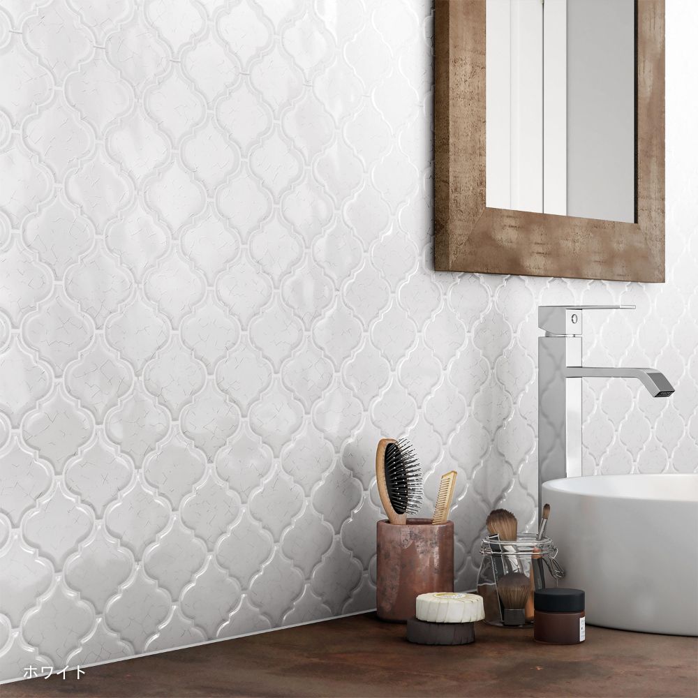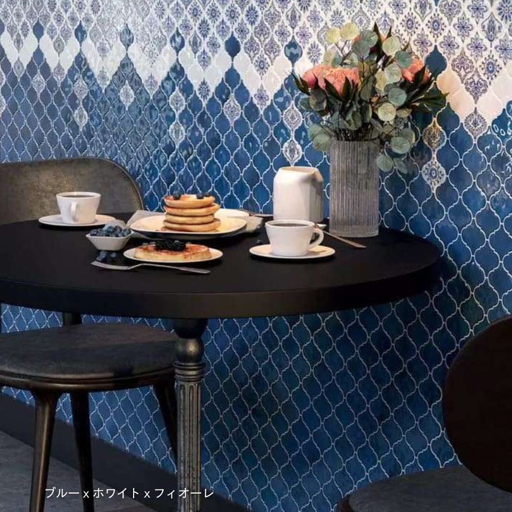 発色が良く、美しい形は壁面をアートのように魅せるタイルです。ランタン、アラベスクなどの呼び名のあるデザインは、古代ギリシャやローマの装飾模様が起源とされ、その後、サーサーン朝ペルシャを経てイスラム世界に伝わったと考えられています。