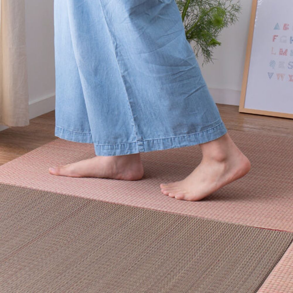 | 表面:い草100% ニ二目織 中材:ポリエステル(フェルト) 裏面:不織布(滑りにくい加工付 裏面5カ所) ※縁無し仕様 |